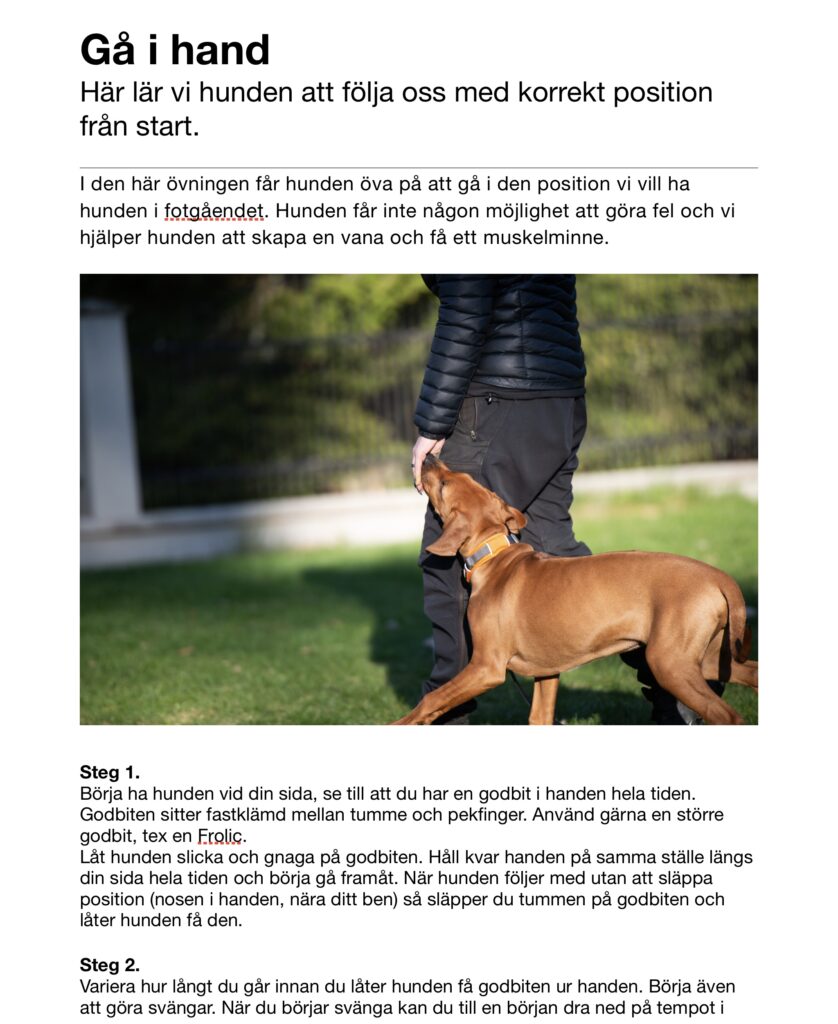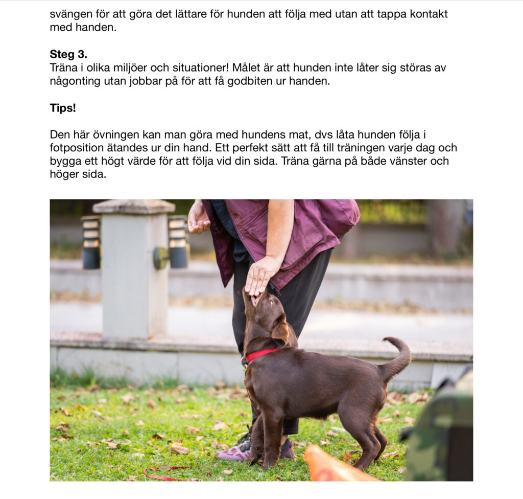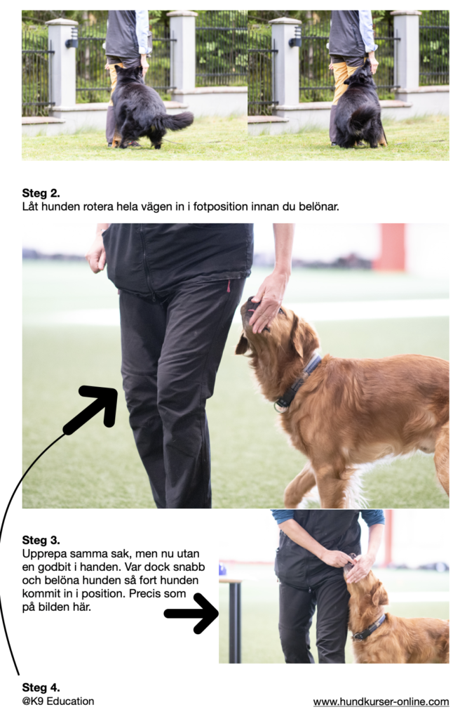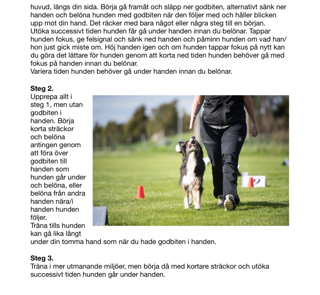 När du tränar tekniken och detaljerna som vi gjort i lektionerna hittills så belönar du hunden i position, det vill säga där du vill ha din hund. Men när du vill öva på engagemanget och uthålligheten i fotgåendet, det vill säga helheten, då behöver belöningen ske på ett annorlunda sätt.