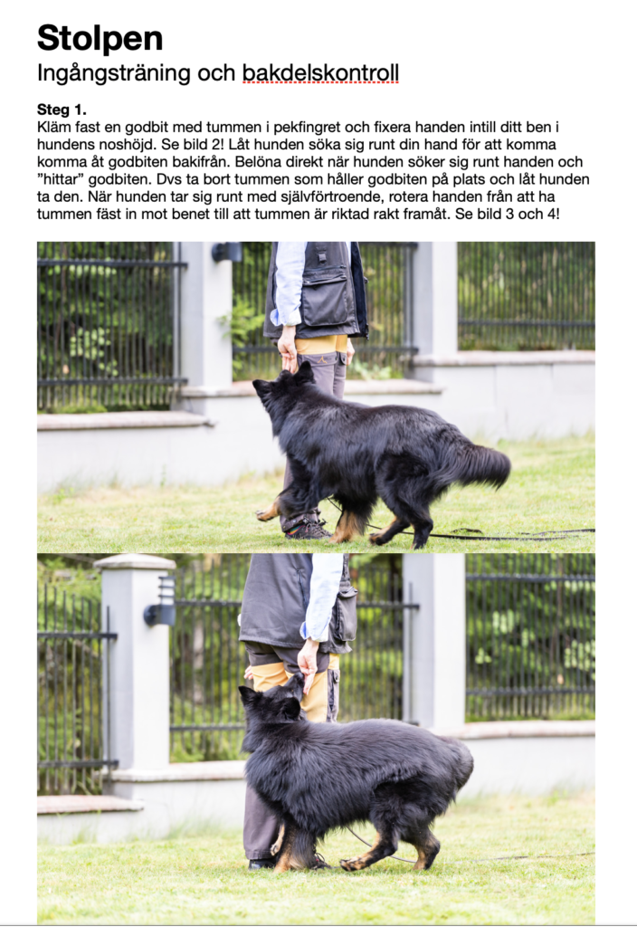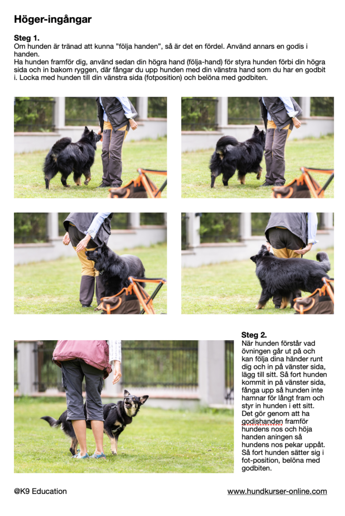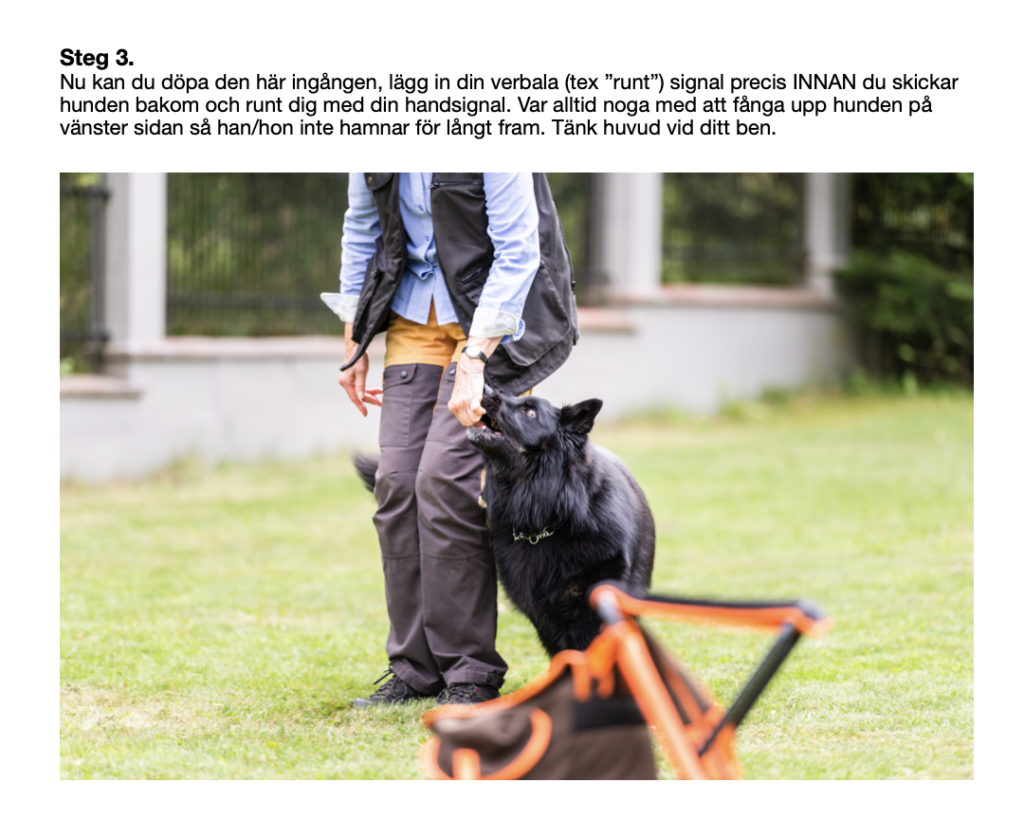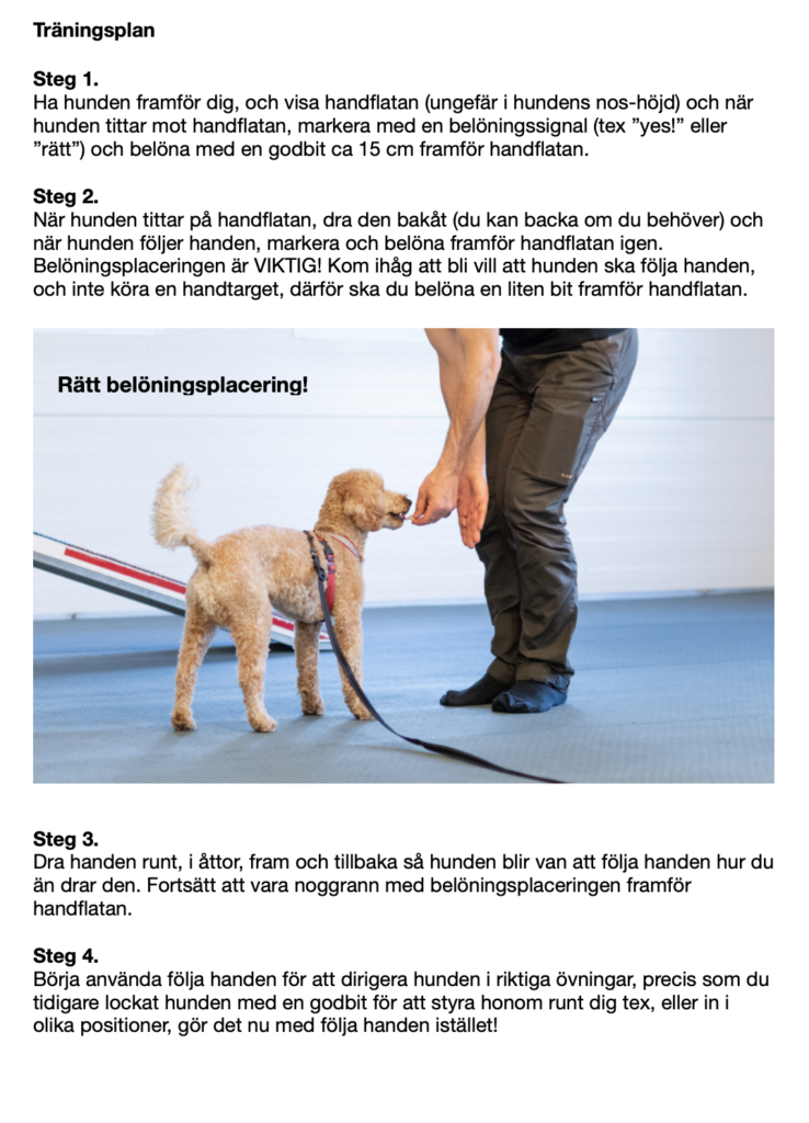 För att lära hunden att öka på takten i yttervarv och sakna ned farten i innervarv så är denna övning superbra. Börja med att gå med hunden både i innervarv och yttervarv (på filmen ser ni yttervarv, dvs förare närmast konerna), målet är att hunden hela tiden ligger under hand och anpassar sin fart till föraren. Har du en het hunden kommer du att behöva träna mer innervarv och har du en mer låg-tempererad hund så kan du behöva träna mer yttervarv. I yttervarv belönar du i position om hunden följer i rätt takt och ligger under hand. Om hunden halkar efter och inte lyckas hålla position behöver du belöna framåt tills hunden har fått en förväntan framåt och ökat på takten. Då kan du återgå till att belöna i position. I Innervarv belönar du i position om hunden följer i rätt takt och ligger under hand. Om hunden tränger/ligger för långt fram och inte lyckas hålla position behöver du belöna bak på låret/baken tills hunden har fått en förståelse om hålla lägre tempo i innervarven. Träna på skynda på handen.
