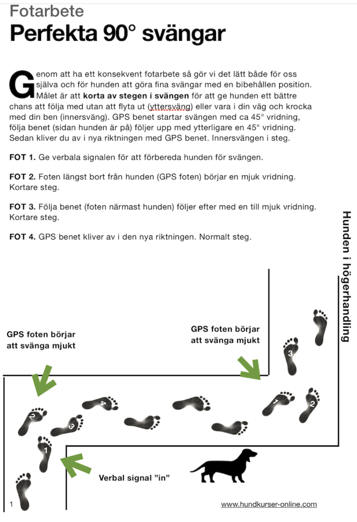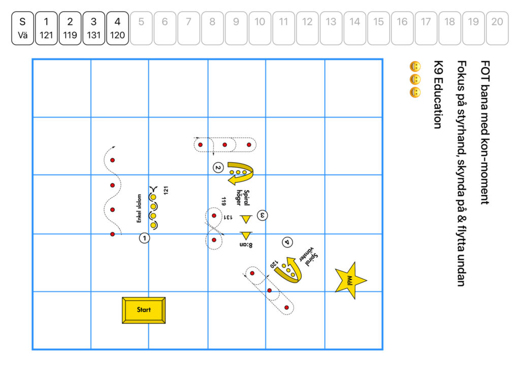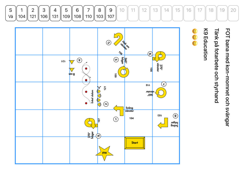 I den här banan lägger vi in de olika svängarna 90°, 180°, 270°, 360° och Looparna och lägger en stor vikt vid fotarbetet så vi är tydliga och visar hunden vilket håll vi kommer att svänga åt.